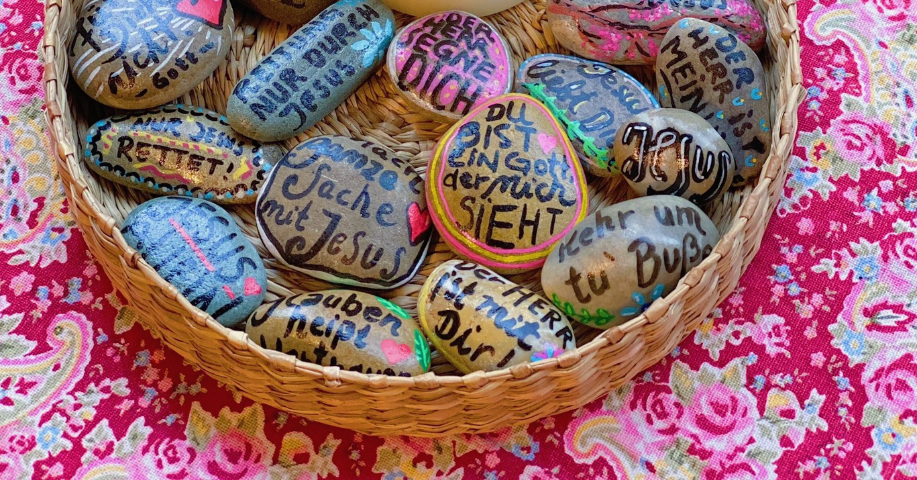 Hast Du schon mal einen bemalten Stein gefunden? Das ist immer eine besondere Freude, oder? Viele malen Blumen oder Tiere auf Steine. Man kann aber auch Gottes Wort auf diese Weise weitergeben.