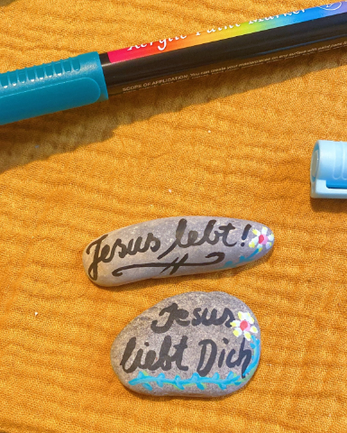 Es gibt extra Stifte, um Steine zu bemalten. Du kannst aber auch ganz normale Eddings nutzen. Wenn du möchtest, dass deine Botschaften leuchten und glänzen und vor Nässe geschützt sind, kannst du bemalte Seite anschließend mit Sprühlack einsprühen, bevor du sie beim nächsten Spaziergang dann für andere auslegst. Den Lack kann man im Baumarkt kaufen.