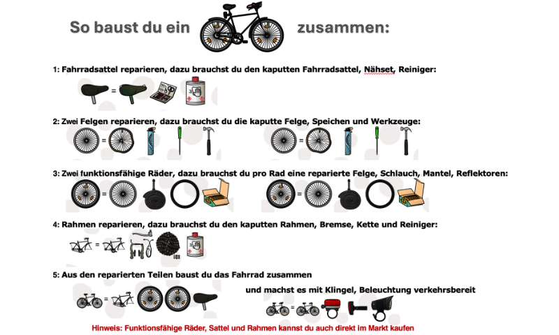 5: Fahrbereites Fahrrad zusammensetzen = Fahrradrahmen + zwei Räder + Sattel.