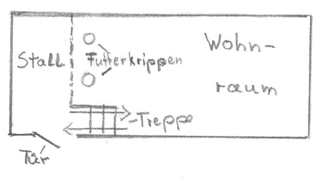 ... hatten nur einen einzigen Raum. Dort spielte sich das Leben ab. Der hintere Teil des Raums war etwas erhöht. Das war der Wohnraum. Hier lebten die Menschen. Im vorderen Teil, wenige Treppen herunter, lebten die Tiere (Schafe, Ziegen, …). Im Bild siehst du den Grundriss eines solchen Hauses.