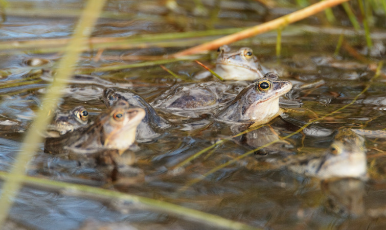 Im Frühling, wenn die Temperatur über 12 °C steigt, machen sich zuerst die Moorfrosch-Männchen aus ihrem Winterquartier auf den Weg zu dem Platz, wo sie sich mit vielen anderen Moorfröschen treffen, um sich zu vermehren.
