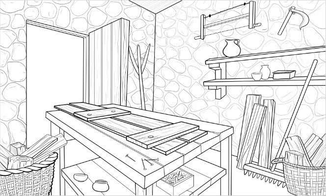Ergänze die Werkstatt. Welche Werkzeuge kann Josef noch gebrauchen? Josef selbst darf natürlich auch nicht fehlen.