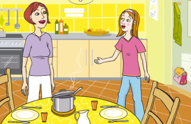„Oh, das tut mir leid für Svetlana“, meint Mama und fordert Karo dann auf: „Geh dir bitte die Hände waschen. Wir wollen gleich essen.“
