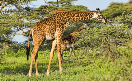 Die Giraffe ergreift einen Zweig mit ihrer Zunge, führt ihn ins Maul und weidet durch Zurückziehen des Kopfes die Blätter ab. Um satt zu werden, braucht sie 30 kg Grünfutter am Tag.