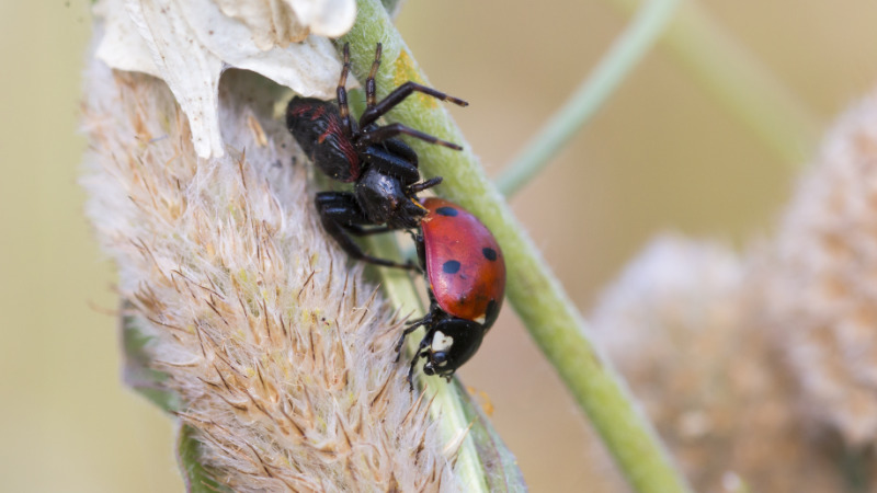Marienkäfer haben zahlreiche Feinde, zum Beispiel Vögel, Eidechsen, Spitzmäuse, Frösche und Spinnen. Wie wehrt sich der Marienkäfer gegen sie? Gott gab dem Käfer eine Geheimwaffe, die er immer bei sich trägt. Es ist eine gelbliche, bittere, übelriechende Flüssigkeit. Sobald sich der Käfer bedroht fühlt, scheidet er diese Flüssigkeit aus. Sie ist für manche Tiere giftig.