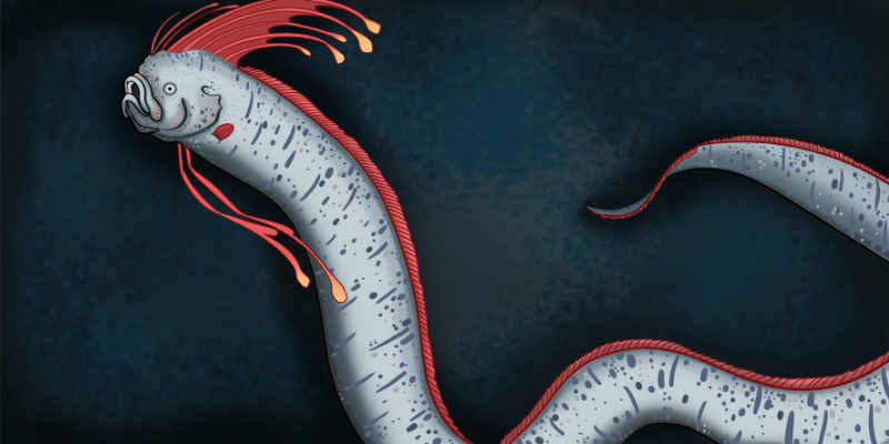 Von dem Kopf des Riemenfisches gehen strahlend rote Fäden mit gelben, diamantförmigen Enden aus.