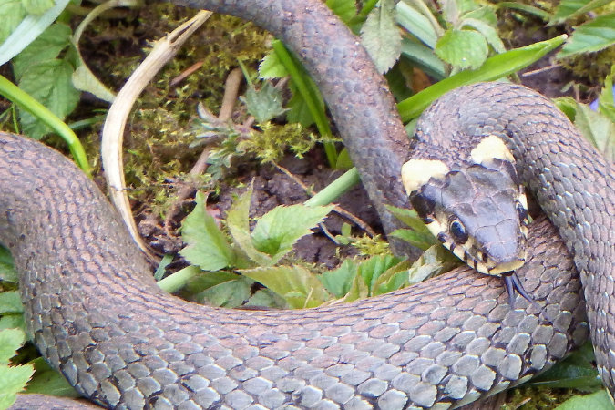 Der Rest des Körpers kann von dunkel-oliv über grau, bis hell mit dunklen Seitenstreifen („Barrenringelnatter“) gefärbt sein. Egal, wie der Körper gefärbt ist, bleibt der Nackenfleck deutlich sichtbar. Dadurch ist sie eindeutig von allen anderen heimischen Schlangen Mitteleuropas und auch der Blindschleiche unterscheidbar.
