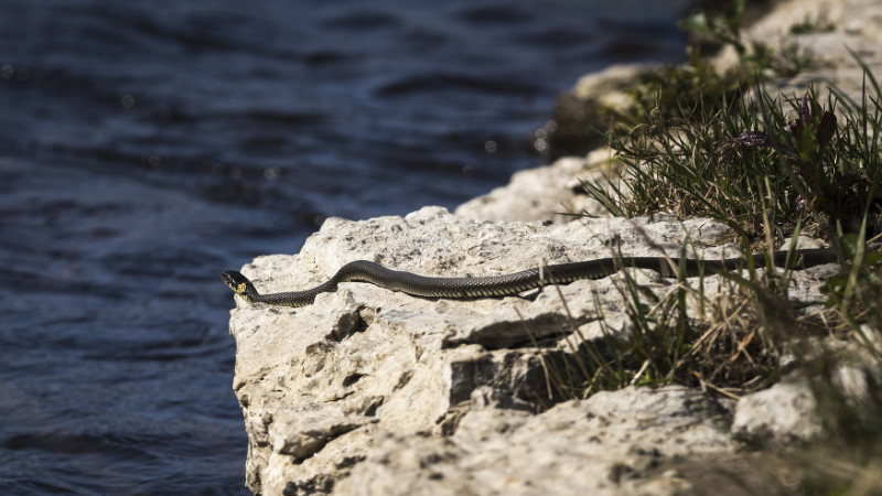 Diese Ringelnatter sonnt sich in der warmen Sonne. Sie ist wie alle Reptilien w...