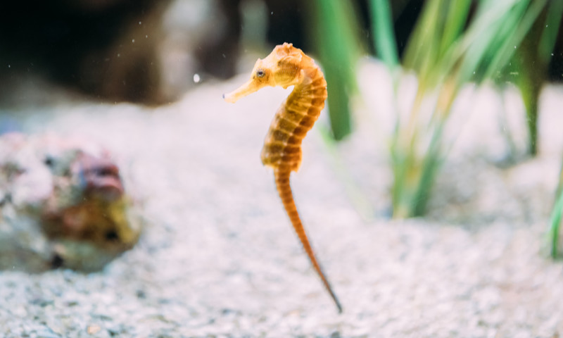 Wenn ein Seepferdchen nach oben schwimmen will, streckt es den sonst gebogenen Schwanz gerade wie einen Stift und atmet dabei ein wenig Luft aus.