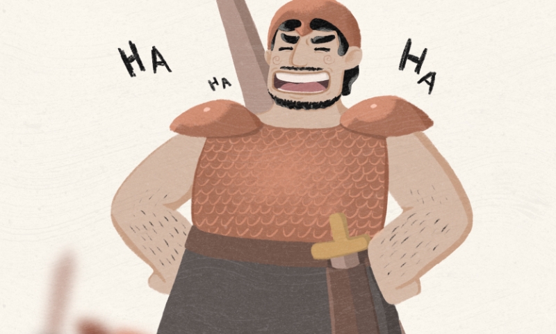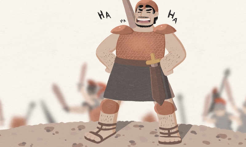 Goliath gröhlte: "Ha, ihr dummen Israeliten, ihr habt ja Angst, hahaha! Euer Gott kann euch nicht helfen. Ich bin stärker als er."
