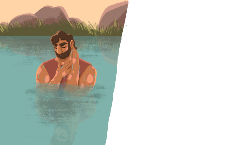 Elisa schickte seinen Diener zu ihm und ließ ihm sagen: „Fahre an den Jordan-Fluss und tauche dich sieben Mal darin unter! Dann wird dein Aussatz verschwinden und du wirst gesund sein!"