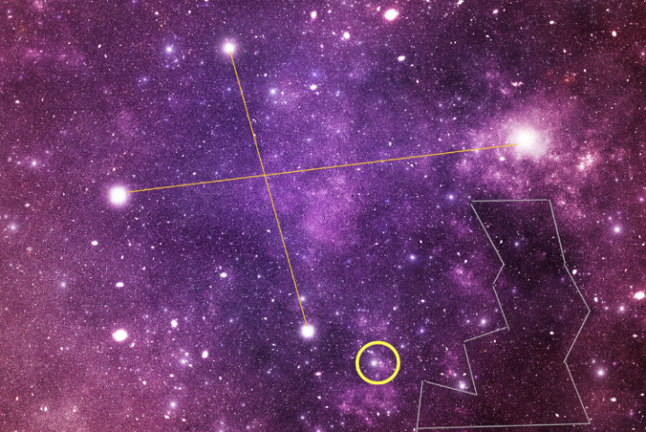 Südlich unter dem linken Kreuzbalken ist eine auffällige dunkle Wolke zu sehen.